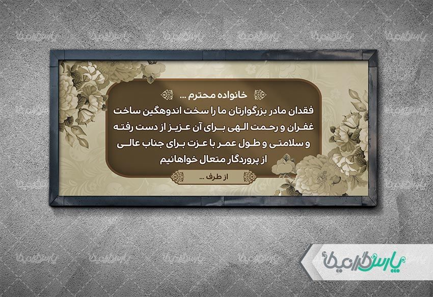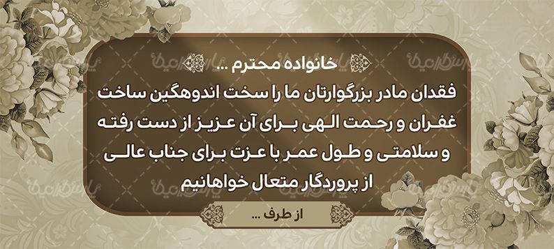 طرح بنر تسلیت بصورت افقی و با زمینه قهوه ای و با استفاده از گل و مرغ طراحی شده است .