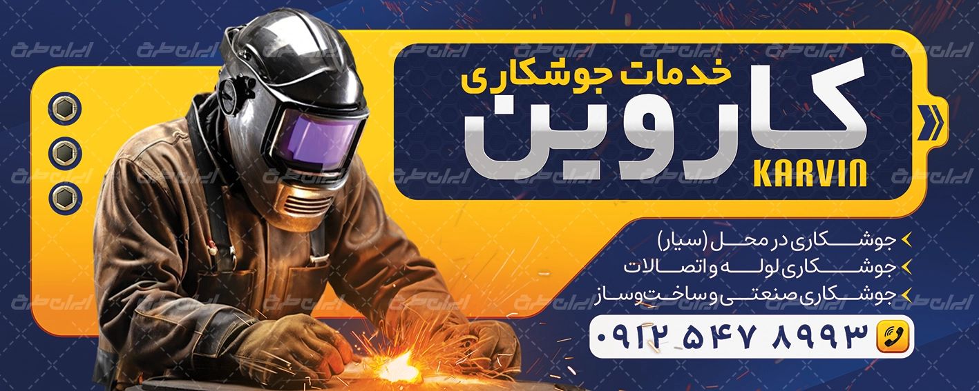 طرح بنر جوشکاری، نمونه ای از بنر های مشاغل مختلف می باشد که جهت بازاریابی و تبلیغات این دسته از مشاغل توسط تیم طراحان ایران طرح طراحی و در دسترس کاربران سایت قرار گرفته است.