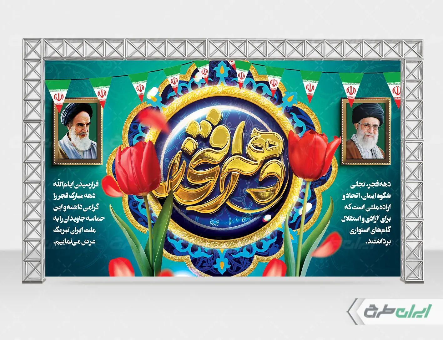 - طراحی بنر با استفاده از طرح گل و پرچم ایران در طرح بنر دهه فجر