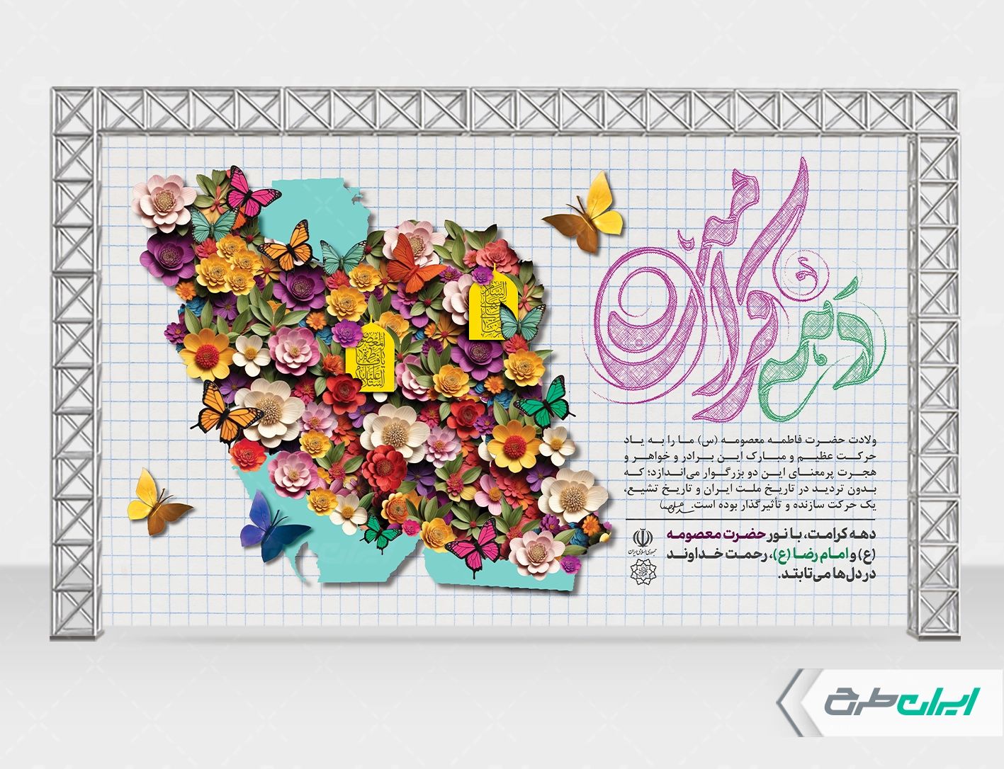 تصویر نقشه ایران و تذهیب و متن گرامیداشت دهه کرامت می باشد که توسط تیم ایران طرح طراحی شده است.