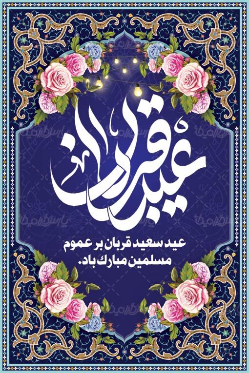 طرح بنر لایه باز عید قربان بصورت عمودی در پس زمینه رنگ سورمه ای با کادر تذهیب طراحی شده است .