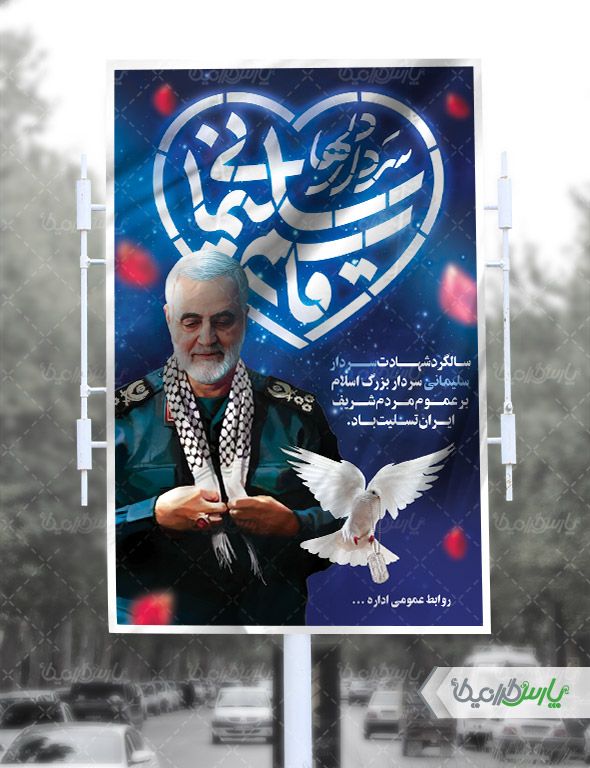 در طرح بنر لایه باز ترحیم از تصویر کبوتر و تصویر سردار شهید سلیمانی استفاده شده است .
