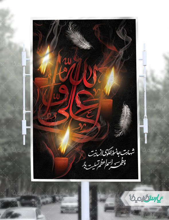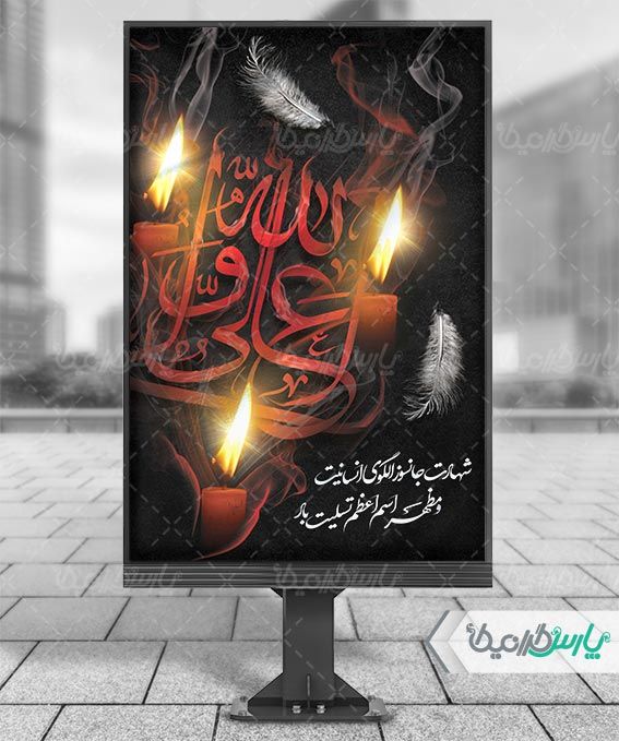 در طرح بنر لایه باز شهادت امیر المونین علی (ع) از تایپوگرافی ( علی ولی الله ) و تصویر شمع استفاده شده است .