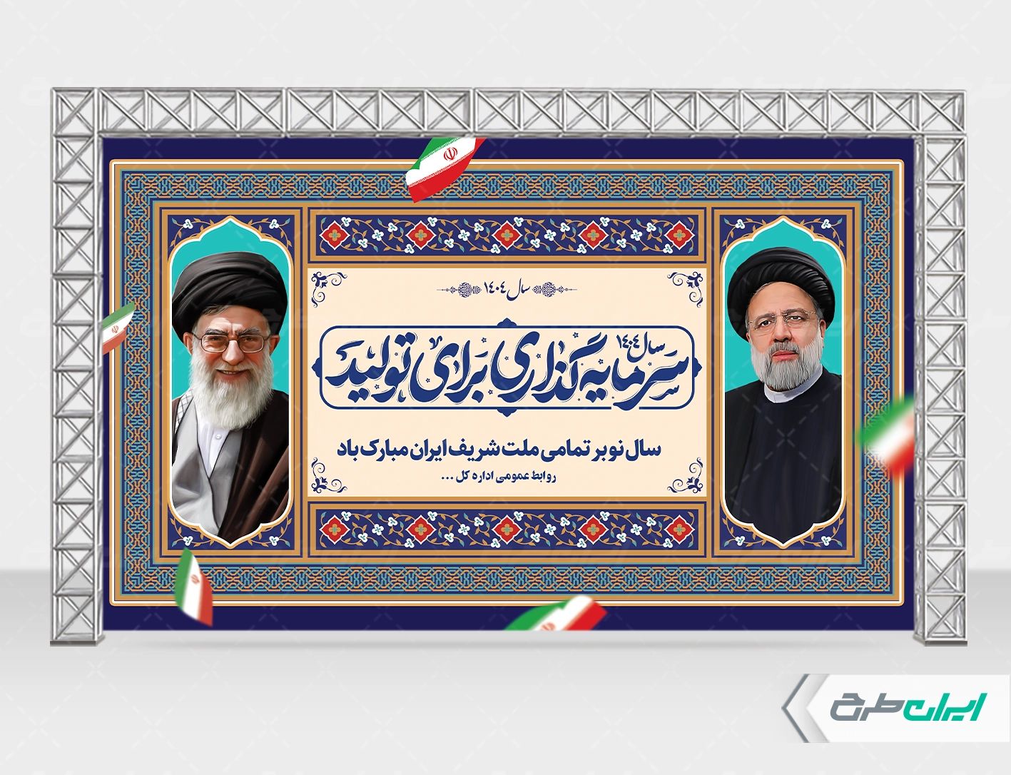 تصویر رهبری و متن شعار سال سرمایه گذاری برای تولید، که توسط تیم ایران طرح طراحی شده است.
