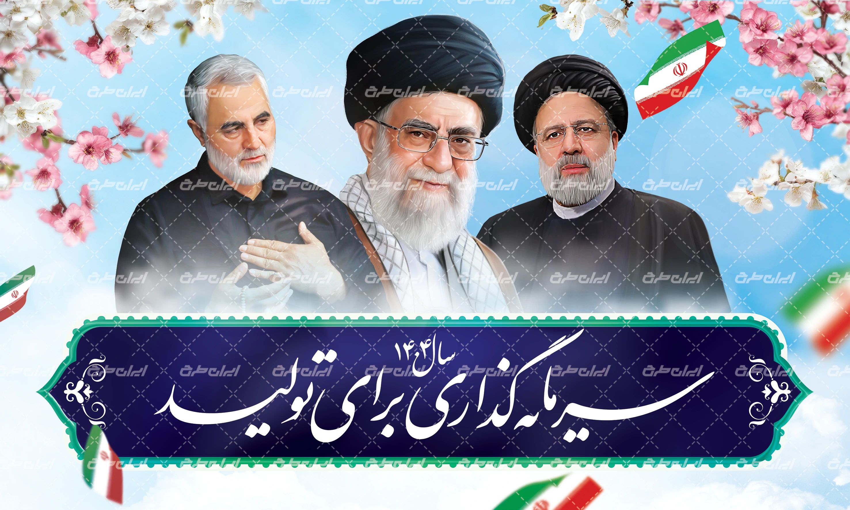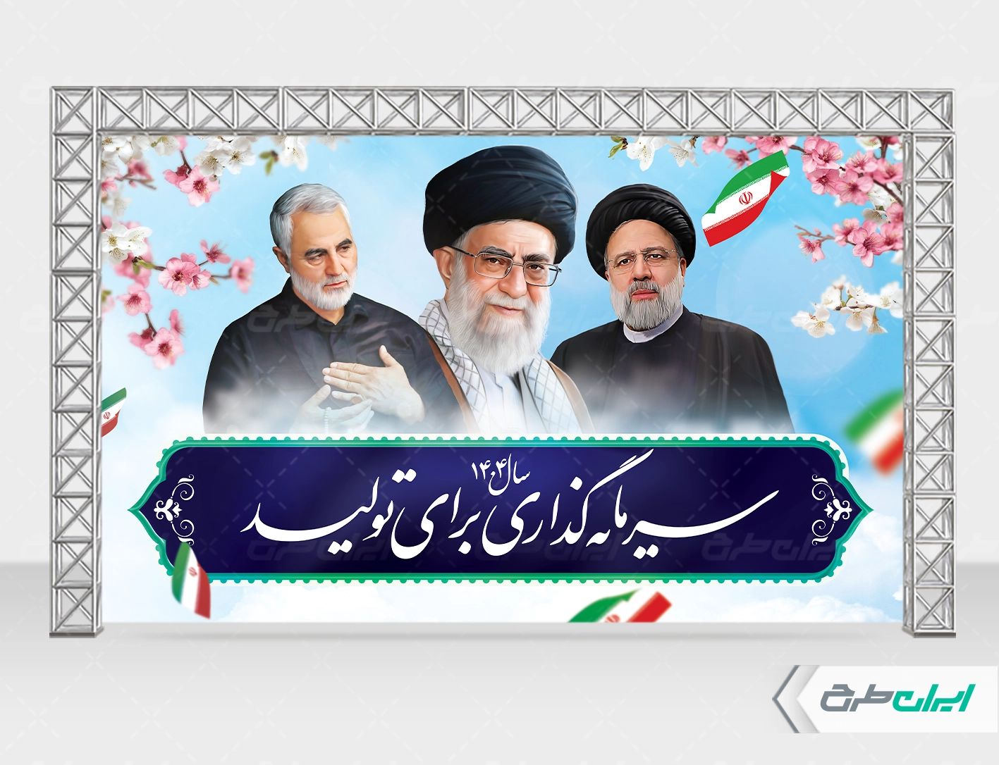تصویر رهبری و متن شعار سال سرمایه گذاری برای تولید، که توسط تیم ایران طرح طراحی شده است.