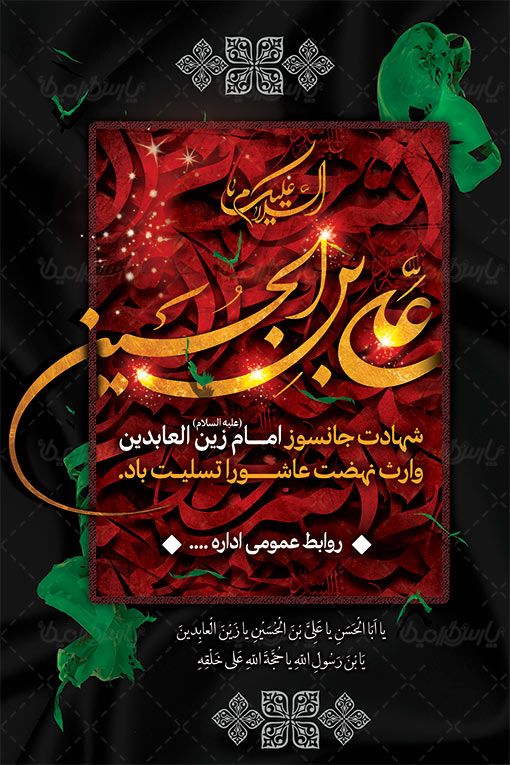 در طرح پوستر شهادت حضرت زین العابدین (ع) در پس زمینه مشکی استفاده شده است .