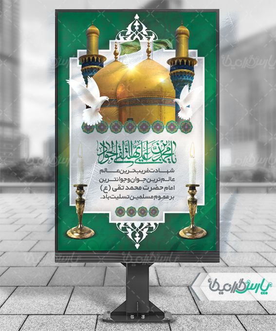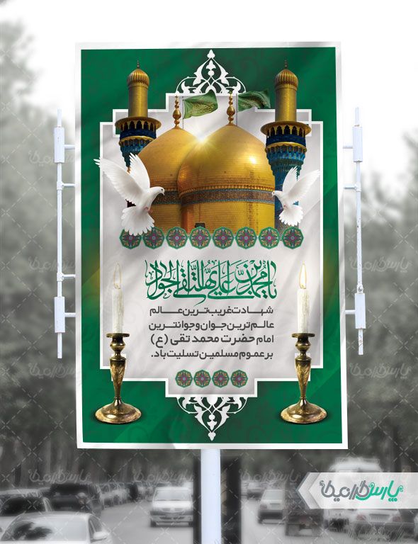 طرح بنر شهادت امام جواد (ع) شامل: تصویر حرم ، کبوتر و شمع و متن تسلیت شهادت امام جواد (ع) می باشد که توسط تیم پارس گرافیک طراحی شده است. به دلیل استفاده از عناصر و المان های با کیفیت در طرح بنر مناسبتی ، می توانید علاوه بر چاپ بنر (به صورت افقی)، در استوری اینستاگرام و یا دیگر پلت فرم های فضای مجازی استفاده نمایید. ضمنا به دلیل لایه باز بود طرح بنر شهادت امام جواد (ع) می توانید با استفاده از نرم افزار فتوشاپ تغییرات دلخواه خود را اعمال کنید.