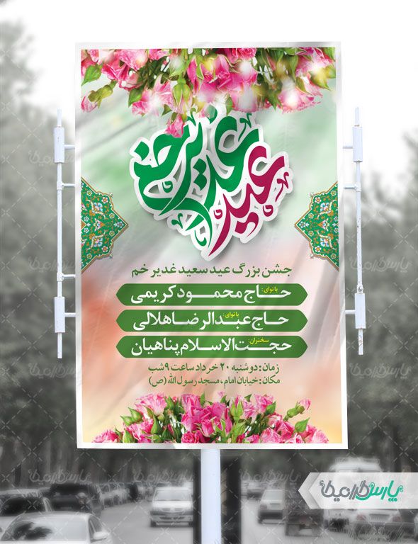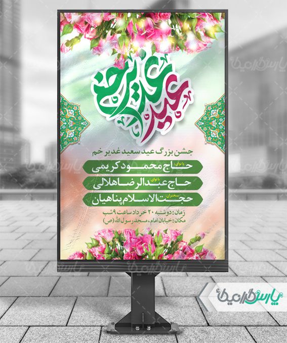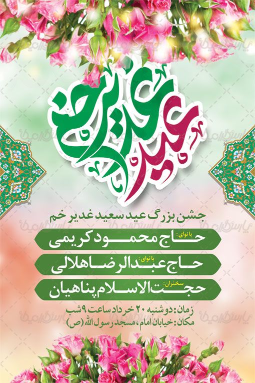 طرح بنر عید غدیر خم شامل: تصویر گل و متن مرتبط با مراسم عید غدیر خم می باشد که توسط طراحان پارس گرافیک در نرم افزار فتوشاپ طراحی شده است. به دلیل استفاده از عناصر و المان های با کیفیت در طرح بنر مناسبتی ، می توانید علاوه بر چاپ بنر (به صورت افقی)، در استوری اینستاگرام و یا دیگر پلت فرم های فضای مجازی استفاده نمایید. ضمنا به دلیل لایه باز بود طرح بنر روز ازدواج می توانید با استفاده از نرم افزار فتوشاپ تغییرات دلخواه خود را اعمال کنید.
