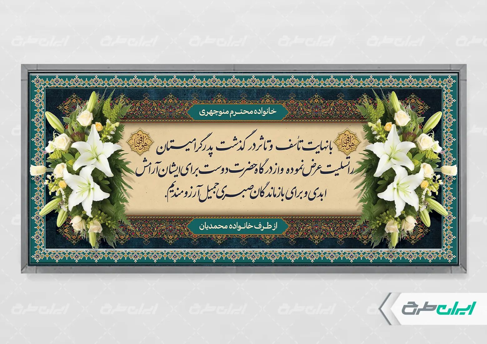 طرح بنر تسلیت ، توسط تیم حرفه ای ایران طرح جهت استفاده کاربران سایت طراحی و به صورت لایه باز در دسترس کاربران قرار گرفته است.