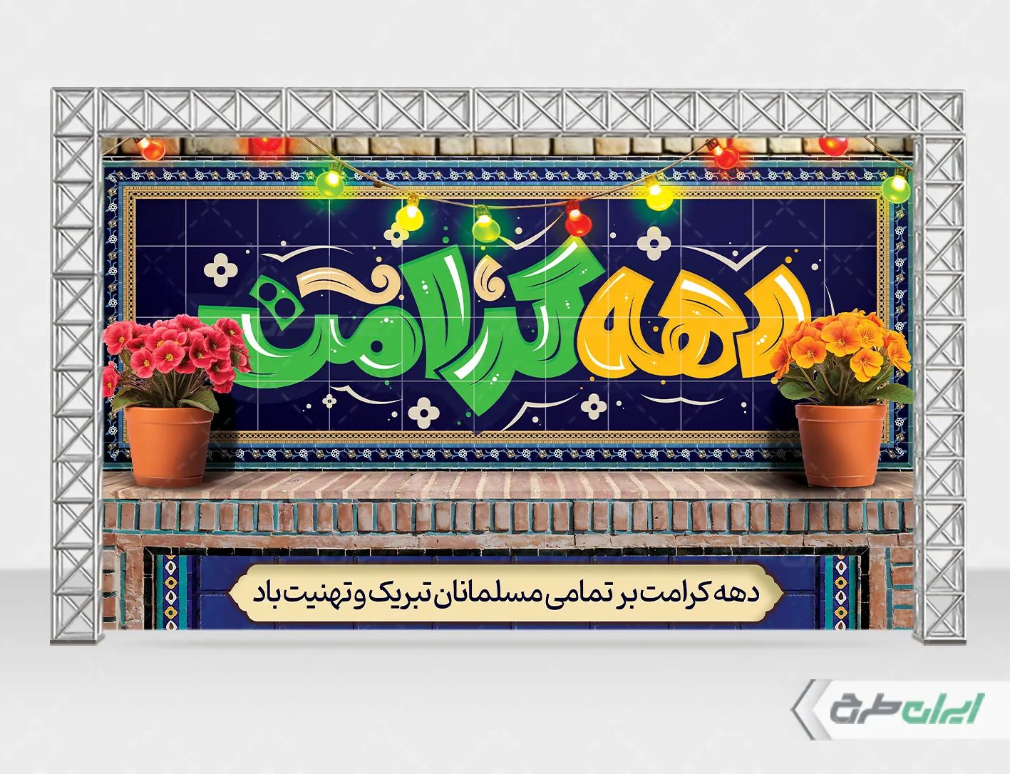 بنر دهه کرامت، توسط تیم حرفه ای ایران طرح جهت استفاده کاربران سایت طراحی و به صورت لایه باز در دسترس کاربران قرار گرفته است.