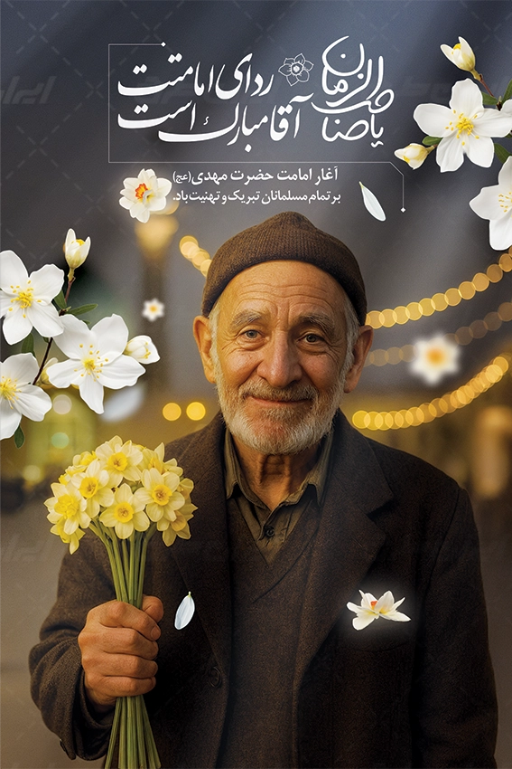 تصویر پیرمرد و گل نرگس و متن تبریک آغاز امامت امام زمان می باشد که توسط تیم ایران طرح طراحی شده است.