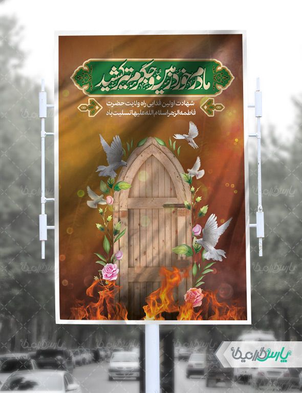 طرح بنر دهه فاطمیه شامل:تصویر در ، کبوتر ، آتش، و متن تسلیت شهادت حضرت فاطمه می باشد که توسط تیم پارس گرافیک طراحی شده است. به دلیل استفاده از عناصر و المان های با کیفیت در طرح بنر مناسبتی ، می توانید علاوه بر چاپ بنر (به صورت عمودی)، در استوری اینستاگرام و یا دیگر پلت فرم های فضای مجازی استفاده نمایید. ضمنا به دلیل لایه باز بود طرح بنر سالگرد حضرت فاطمه زهرا می توانید با استفاده از نرم افزار فتوشاپ تغییرات دلخواه خود را اعمال کنید.