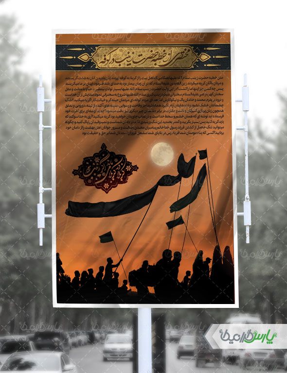 طرح لایه باز بنر خطبه حضرت زینب در روز عاشورا بصورت عمودی طراحی شده است.
