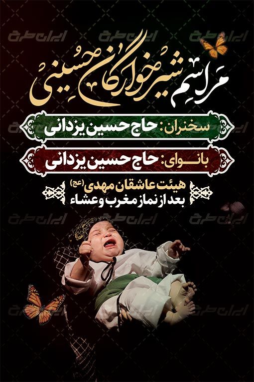 طرح بنر مراسم شیرخوارگان شامل: تصویر نوزاد، تایپوگرافی شیرخوارگان حسینی و متن مرتبط در طرح بنر می باشد که توسط طراحان ایران طرح در نرم افزار فتوشاپ طراحی شده است. به دلیل لایه باز (قابل ویرایش توسط کاربران در نرم افزار فتوشاپ Adobe Photoshop) بودن و کیفیت بالای عناصر و المان های استفاده شده در طرح، می توانید علاوه بر چاپ بنر(به صورت افقی)، در استوری اینستاگرام و سایر پلت فرم های فضای مجازی جهت عرض تسلیت و ابراز همدردی با امت بزرگ اسلامی استفاده نمایید.