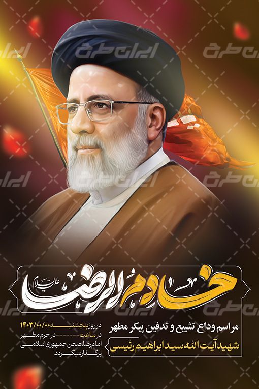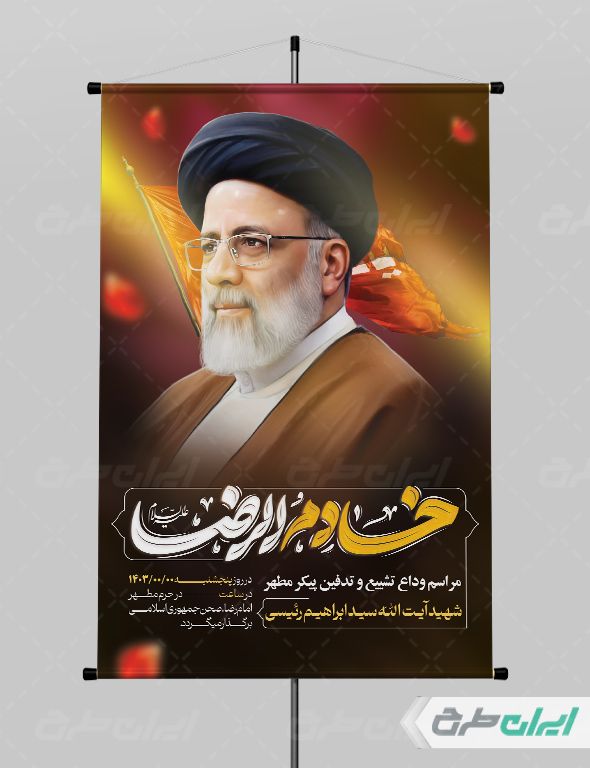 طرح بنر تسلیت افراد شاخص شامل:تصویر سید ابراهیم رئیسی ، تایپوگرافی خادم الرضا و متن تسلیت شهادت سید ابراهیم رئیسی می باشد که توسط تیم ایران طرح طراحی شده است. به دلیل استفاده از عناصر و المان های با کیفیت در طرح بنر مناسبتی ، می توانید علاوه بر چاپ بنر ، در استوری اینستاگرام و یا دیگر پلت فرم های فضای مجازی استفاده نمایید. ضمنا به دلیل لایه باز بود طرح بنر تسلیت شهادت سید ابراهیم رئیسی می توانید با استفاده از نرم افزار فتوشاپ تغییرات دلخواه خود را اعمال کنید.
