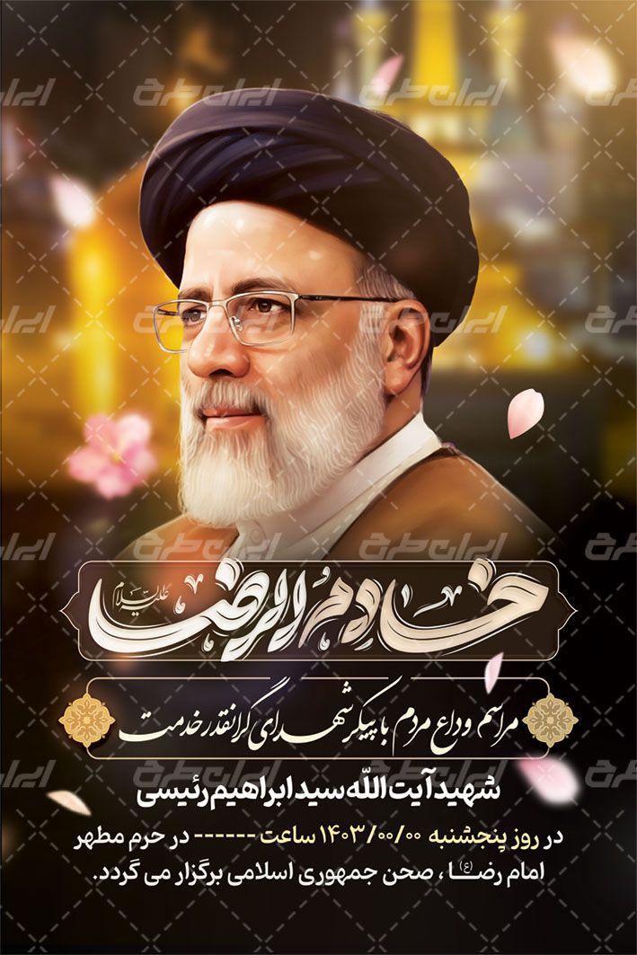طرح بنر تسلیت افراد شاخص شامل:تصویر سید ابراهیم رئیسی ، تایپوگرافی خادم الرضا و متن تسلیت شهادت سید ابراهیم رئیسی می باشد که توسط تیم ایران طرح طراحی شده است. به دلیل استفاده از عناصر و المان های با کیفیت در طرح بنر مناسبتی ، می توانید علاوه بر چاپ بنر ، در استوری اینستاگرام و یا دیگر پلت فرم های فضای مجازی استفاده نمایید. ضمنا به دلیل لایه باز بود طرح بنر تسلیت شهادت سید ابراهیم رئیسی می توانید با استفاده از نرم افزار فتوشاپ تغییرات دلخواه خود را اعمال کنید.