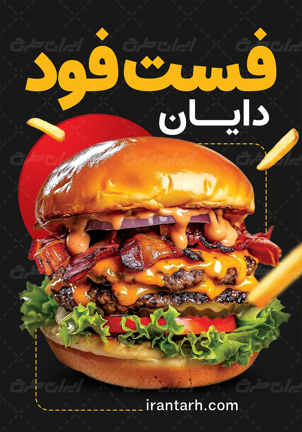 به طور کلی، ترکیب زمینه مشکی، عکس همبرگر جذاب و متن دلنشین میتواند یک بنر فست فود جذاب و موثر را ایجاد کند که توانایی جلب توجه مشتریان و ترویج محصولات را داشته باشد.