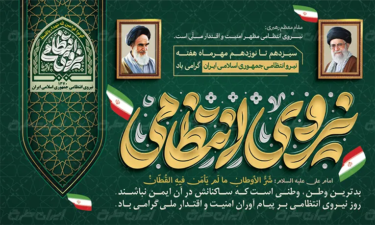 تایپوگرافی هفته نیروی انتظامی گرامی باد، آرم و لوگوی نیروی انتظامی، عکس باکیفیت نیرو انتظامی، گل، کادر مذهبی، پرچم ایران و متن تبریک هفته نیروی انتظامی می باشد که توسط تیم ایران طرح طراحی شده است.