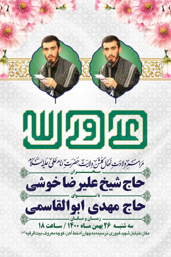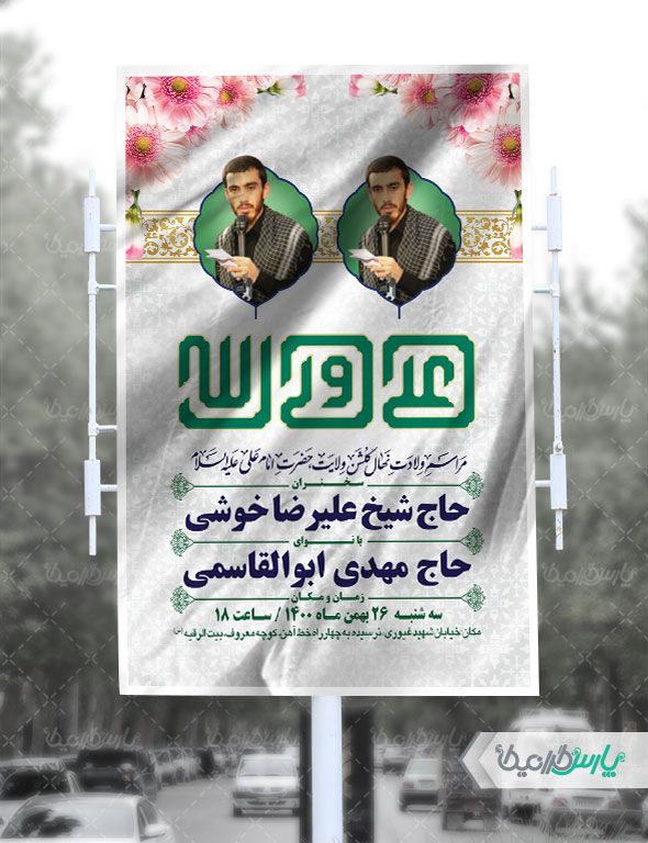 طرح بنر ولادت امام علی شامل: تصویر مداح ، تصویر گل، متن مرتبط با ولادت امام علی (ع ) می باشد که توسط تیم پارس گرافیک طراحی شده است. به دلیل استفاده از عناصر و المان های با کیفیت در طرح بنر مناسبتی ، می توانید علاوه بر چاپ بنر (به صورت افقی)، در استوری اینستاگرام و یا دیگر پلت فرم های فضای مجازی استفاده نمایید. ضمنا به دلیل لایه باز بود طرح بنر ولادت امام علی می توانید با استفاده از نرم افزار فتوشاپ تغییرات دلخواه خود را اعمال کنید.