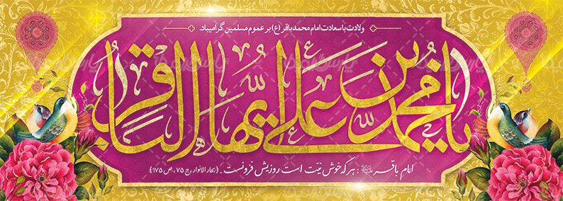 لقب امام باقر (ع) , بنر لایه باز , تایپوگرافی امام باقر , گل و مرغ , طرح بنر ولادت امام باقر (ع) , بنر میلاد امام باقر (ع) , بنر , بنر PSD , طرح بنر لایه باز ولادت امام محمد باقر (ع) ,