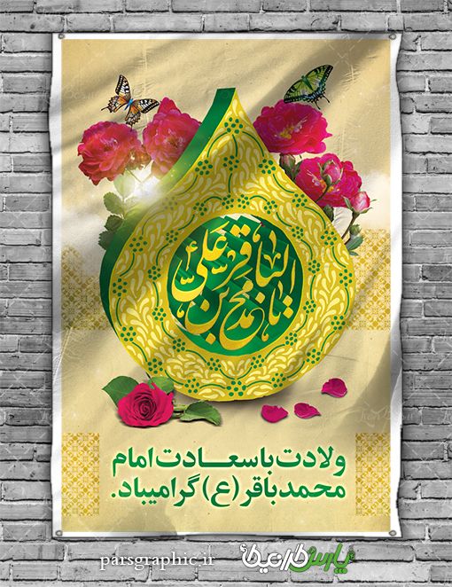 در طرح پوستر ولادت با سعادت امام محمد باقر (ع) که بصورت عمودی طراحی شده است از تایپو گرافی یا محمد بن علی باقر استفاده شده است. زمینه طرح نخودی رنگ و با استفاده از تصویر گل و پروانه طراحی شده است .
