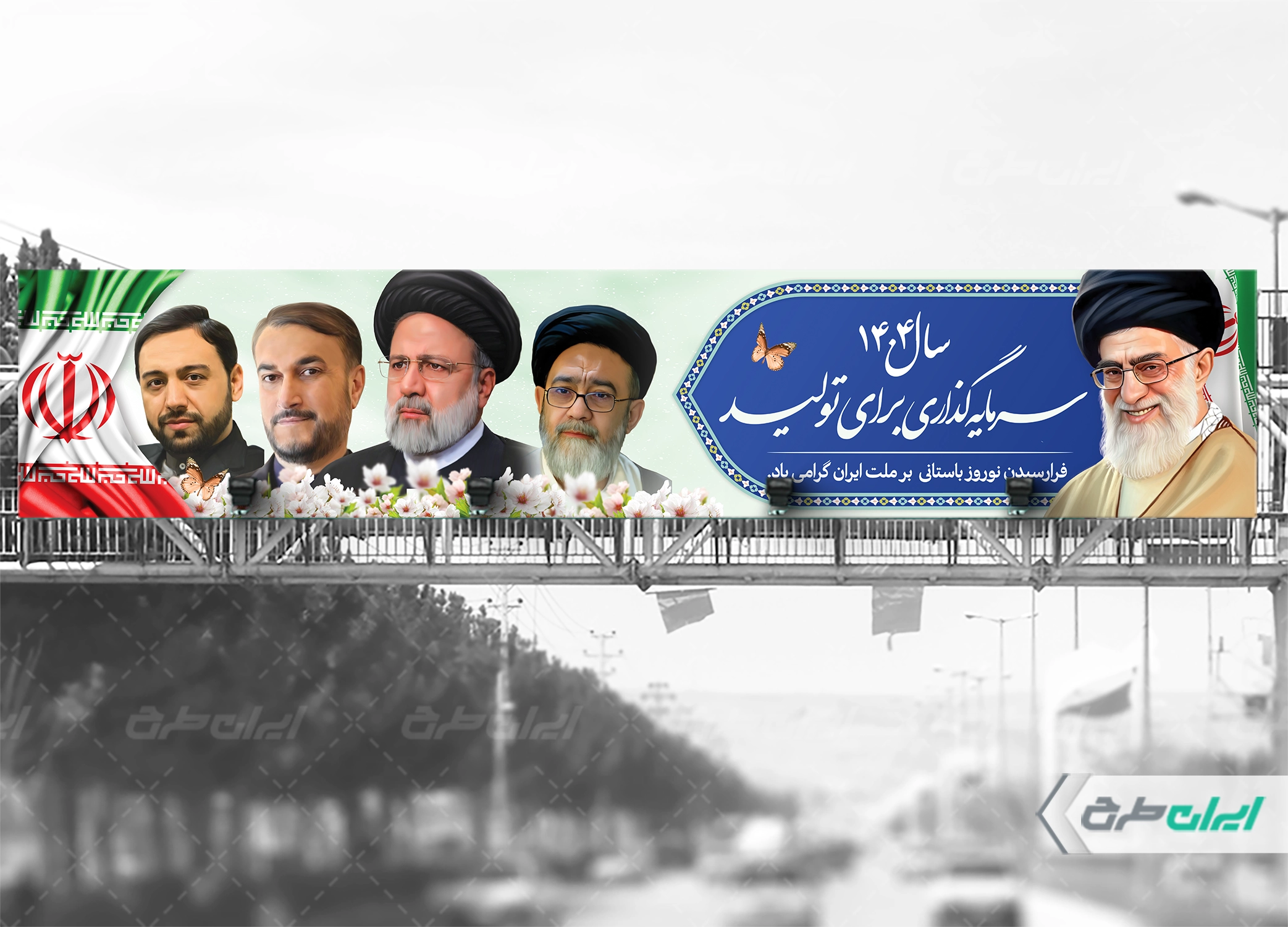 تصویر رهبری و متن شعار سال سرمایه گذاری برای تولید، که توسط تیم ایران طرح طراحی شده است.