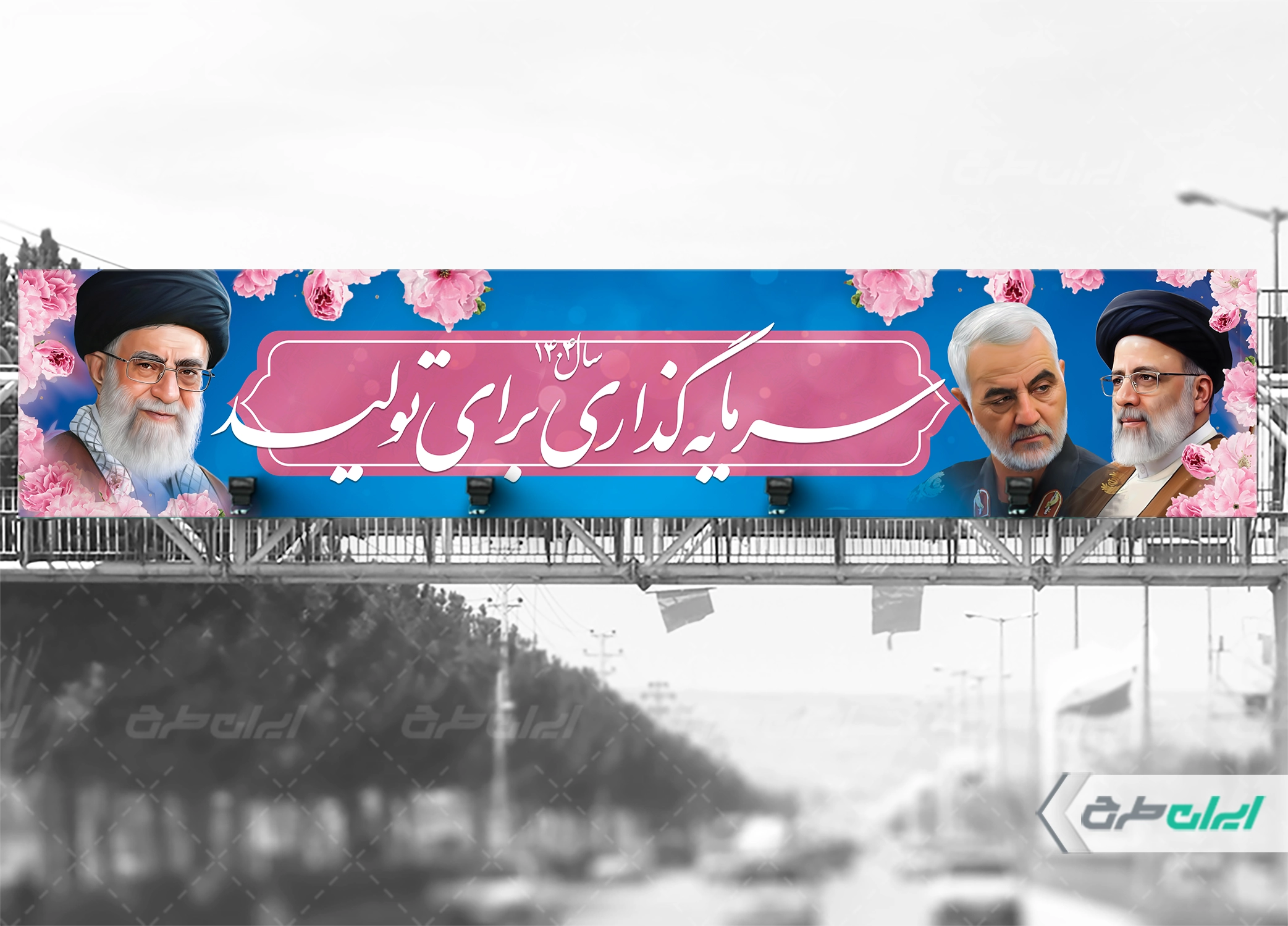 تصویر رهبری و متن شعار سال سرمایه گذاری برای تولید، که توسط تیم ایران طرح طراحی شده است.