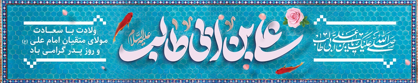 - طراحی بنر با استفاده از تذهیب و تایپوگرافی علی بن ابی طالب در طرح بنر ولادت امام محمد علی