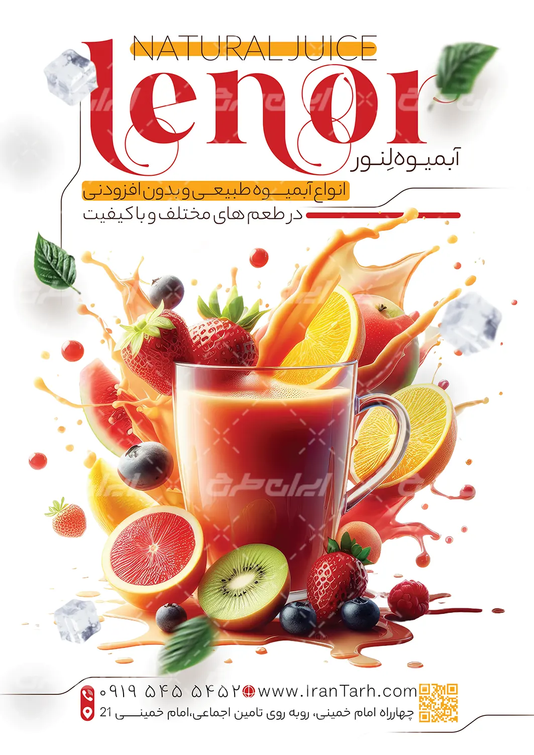 - استفاده از عکس با کیفیت آبمیوه که مناسب با طرح تراکت لایه باز آبمیوه سرا می باشد