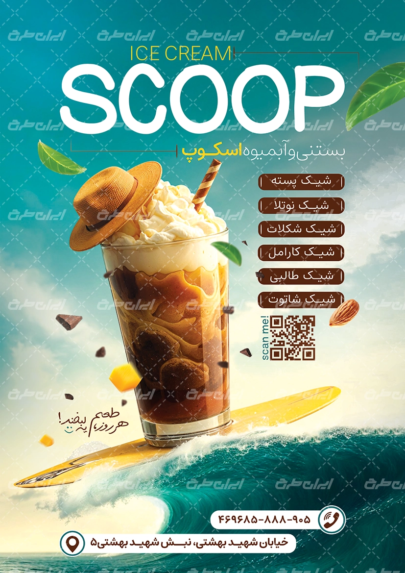 - استفاده از عکس با کیفیت بستنی که مناسب با طرح تراکت لایه باز آبمیوه سرا می باشد.
