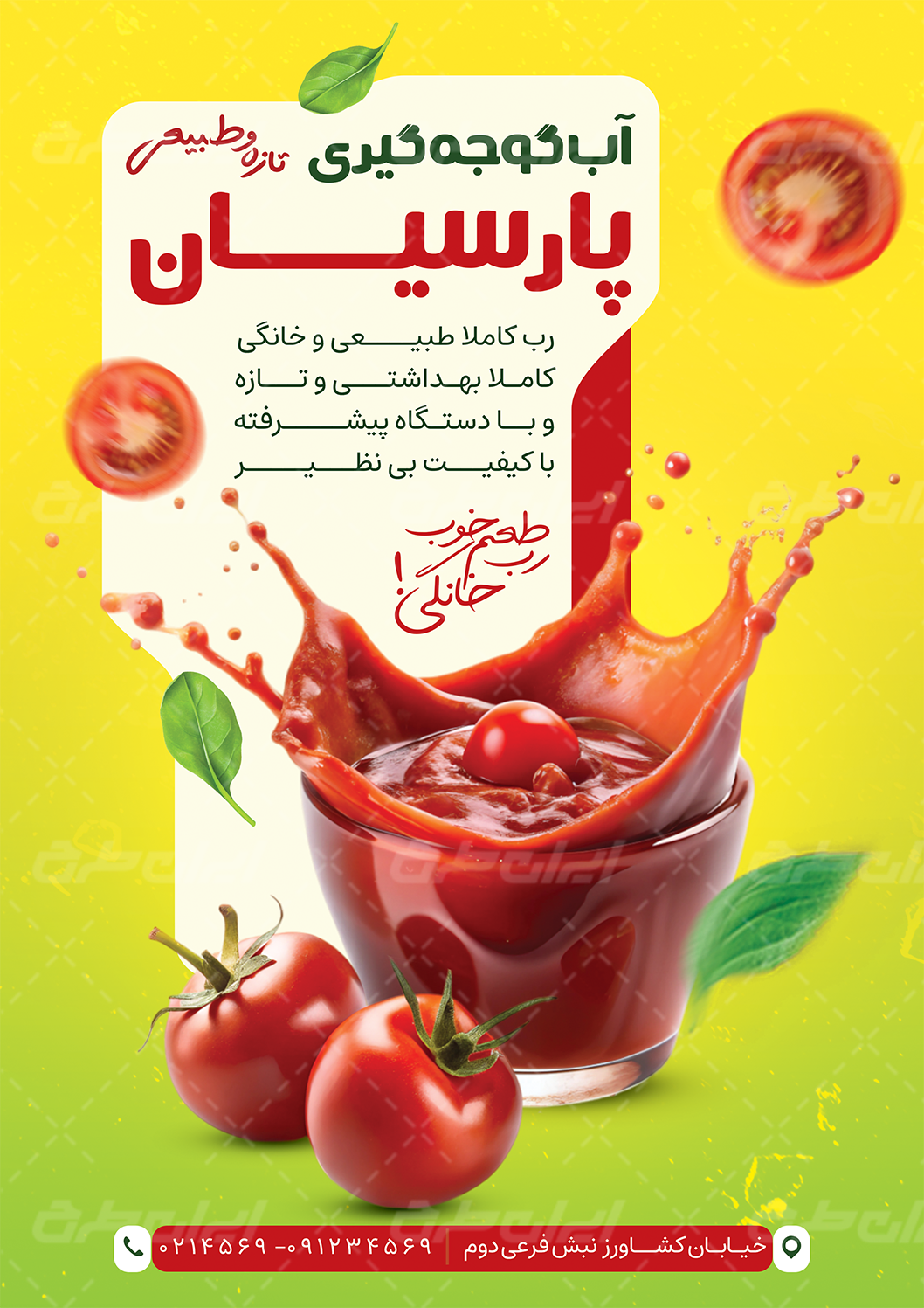 - استفاده مناسب از تصویر گوجه فرنگی در طرح تراکت آب گوجه گیری