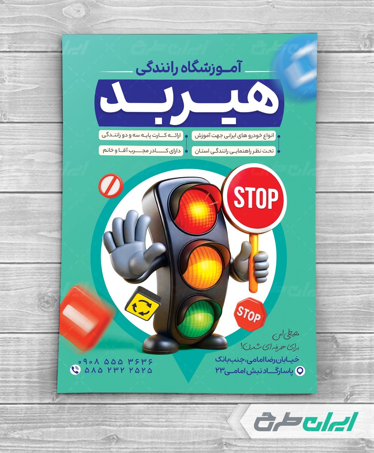 - استفاده مناسب از عکس با کیفیت و وکتور علائم راهنمایی و رانندگی در طرح تراکت آموزشگاه رانندگی