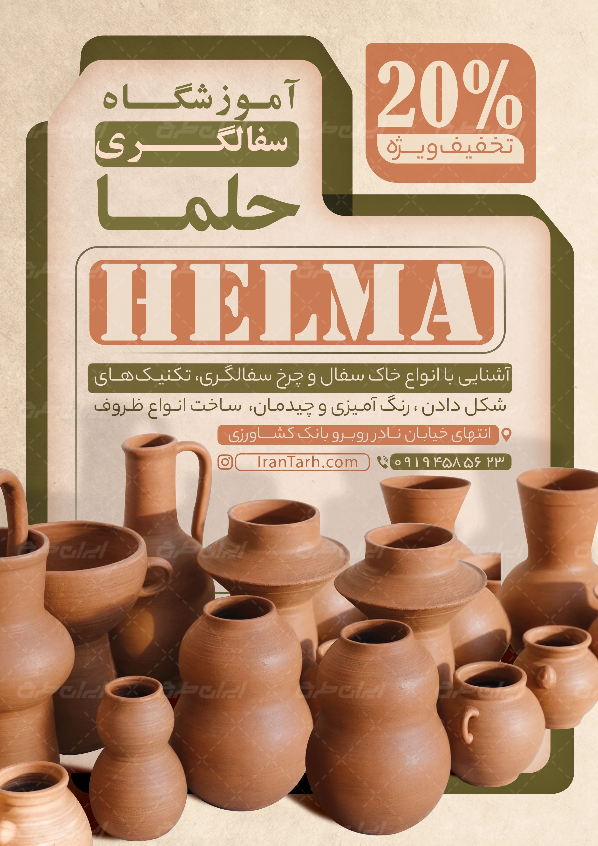طرح تراکت آموزشگاه سفالگری، جهت بازاریابی و تبلیغات این دسته از مشاغل توسط تیم طراحان ایران طرح طراحی و در دسترس کاربران سایت قرار گرفته است.