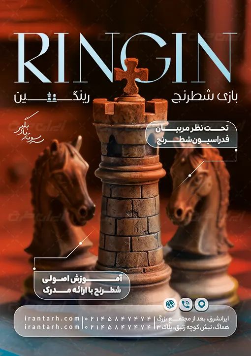 طرح تراکت آموزشگاه شطرنج شامل: تصویر شطرنج ، لیبل و شیپ های کاربردی می باشد که توسط طراحان ایران طرح به صورت افقی در نرم افزار فتوشاپ طراحی شده است.