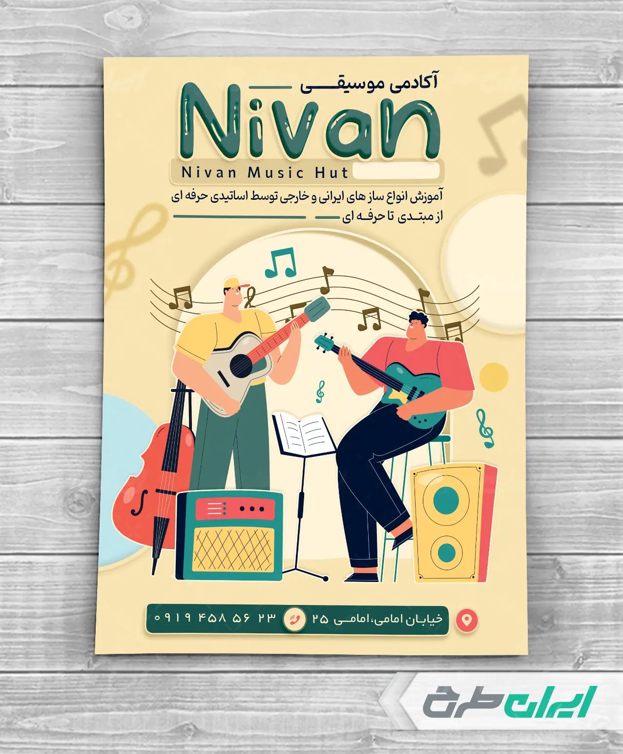 - استفاده مناسب از عکس باکیفیت ابزار آلات موسیقی در طرح تراکت آموزشگاه موسیقی