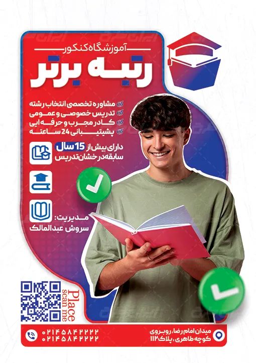 - استفاده مناسب از عکس با کیفیت کتاب در طرح تراکت کلاس های درسی کنکور
