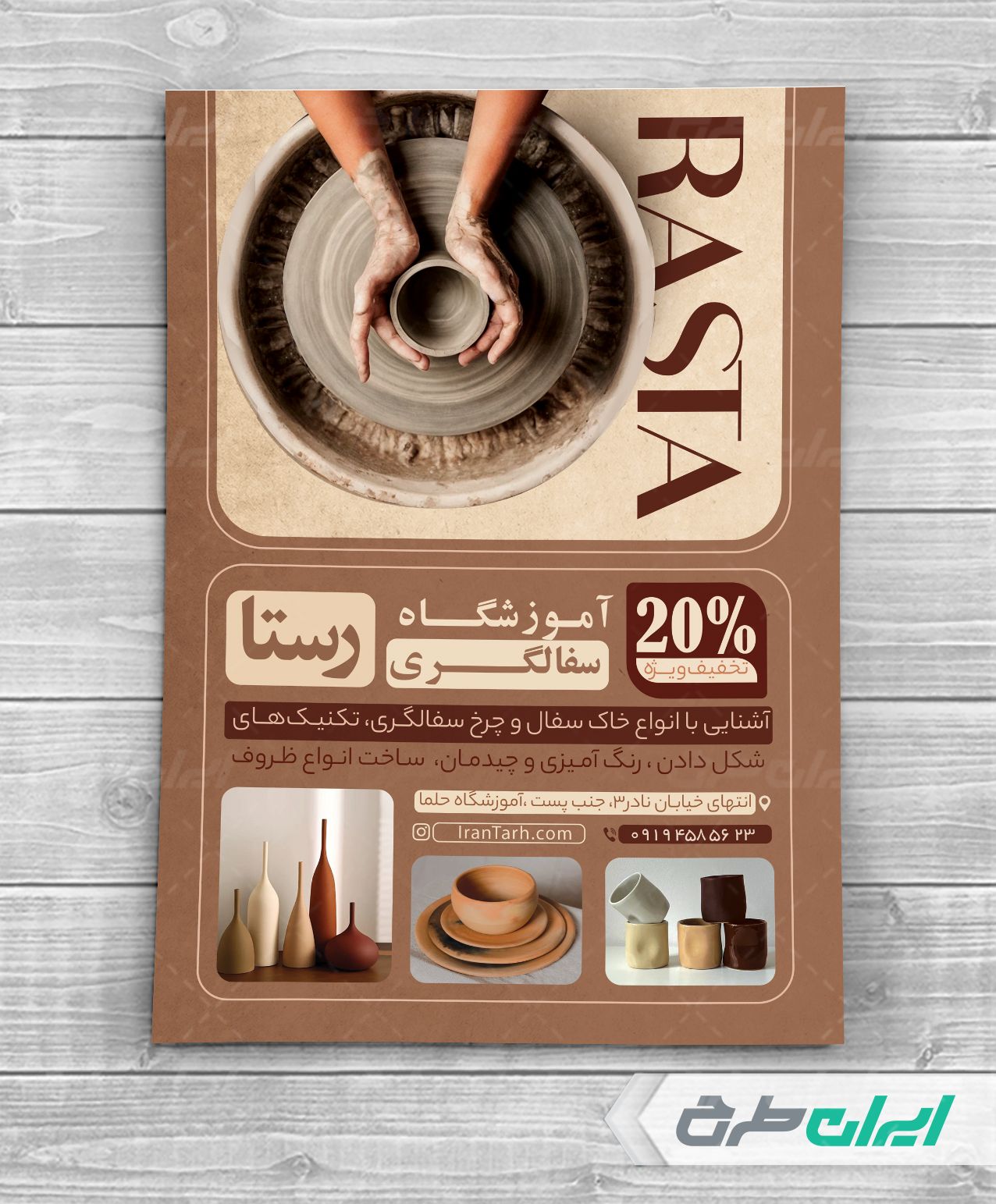 طرح تراکت آموزشگاه سفالگری، جهت بازاریابی و تبلیغات این دسته از مشاغل توسط تیم طراحان ایران طرح طراحی و در دسترس کاربران سایت قرار گرفته است.