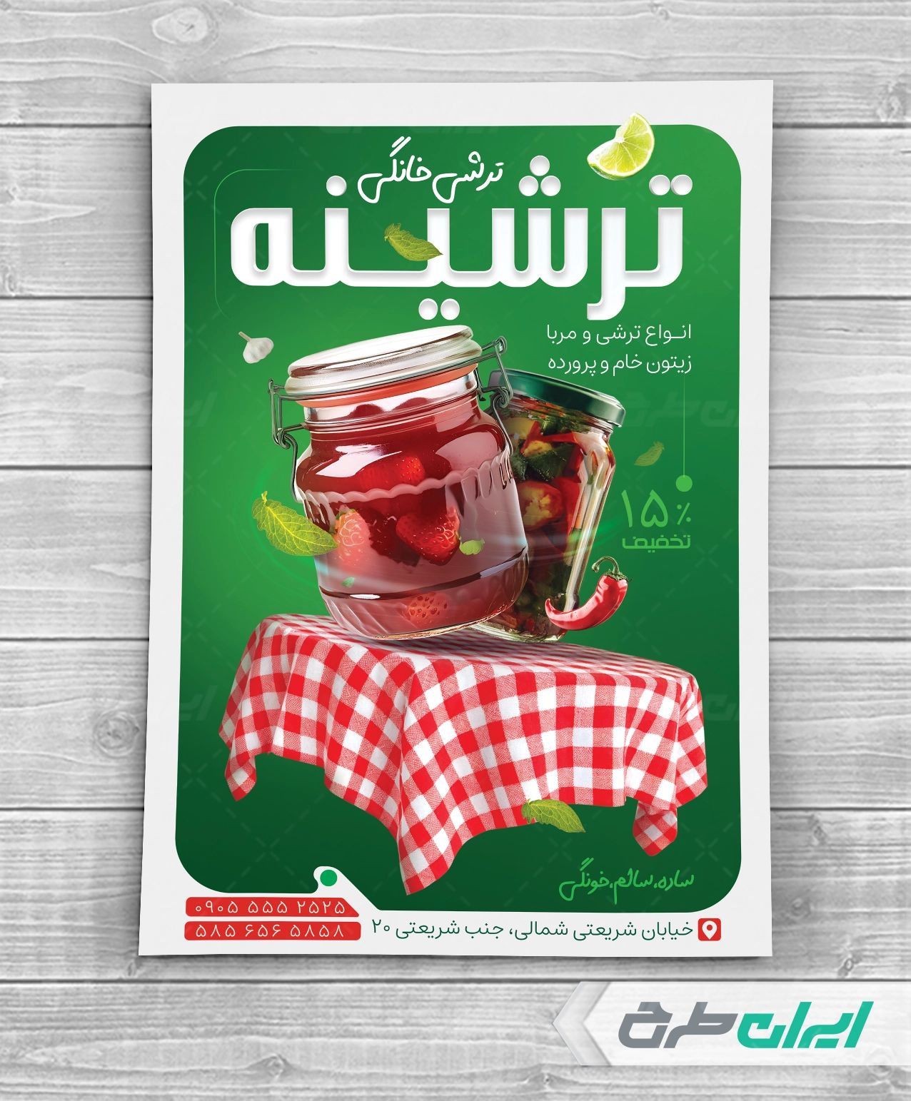 طرح لایه باز تراکت فروشگاه ترشیجات، جهت بازاریابی و تبلیغات این دسته از فروشگاه ها توسط تیم طراحان ایران طرح طراحی و در دسترس کاربران سایت قرار گرفته است.