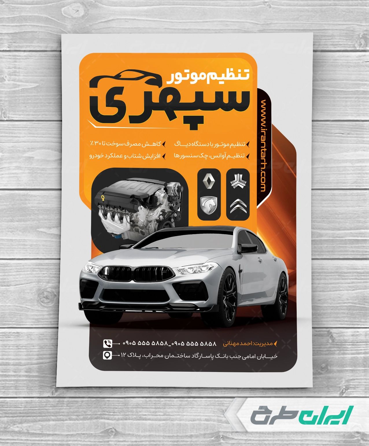 - استفاده مناسب از عکس با کیفیت ماشین در طرح تراکت تنظیم موتور