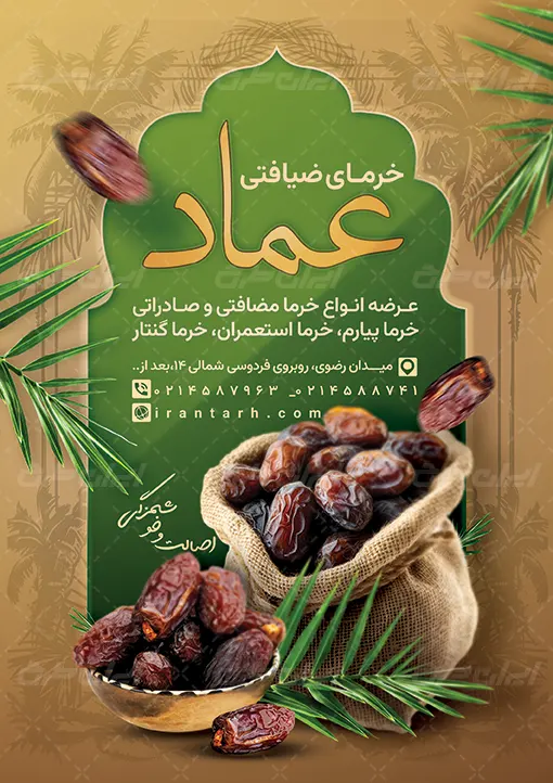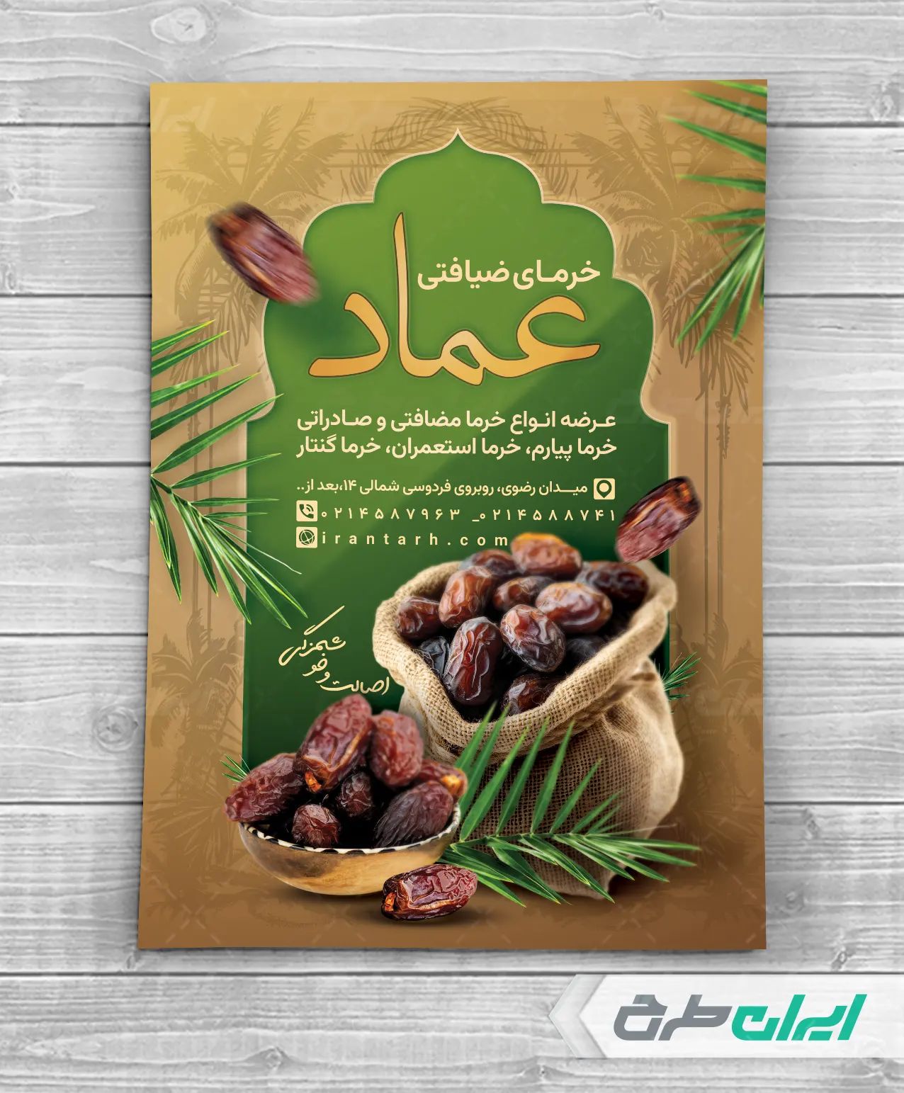 طرح لایه باز تراکت فروشگاه خرما و رطب، جهت بازاریابی و تبلیغات این دسته از فروشگاه ها توسط تیم طراحان ایران طرح طراحی و در دسترس کاربران سایت قرار گرفته است.