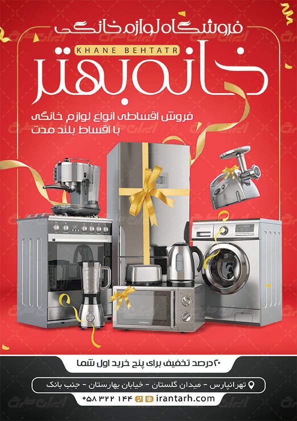 طرح لایه باز تراکت فروشگاه لوازم خانگی برقی با زمینه قرمز و عکسهای لوازم خانگی برقی، ابزاری قدرتمند برای جلب توجه مخاطبان و ترویج محصولات است. در این طرح، عناصر گوناگونی چون رنگ، تصاویر و متن به کار گرفته میشوند تا پیام فروشگاه به بهترین شکل منتقل شود.