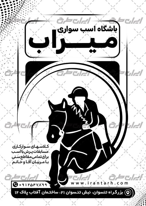 طراحی لایه باز تراکت باشگاه سوارکاری با زمینه مشکی و سفید و وکتور سوارکار، میتواند به طراحی حرفهای و جذاب تراکت کمک کند.
