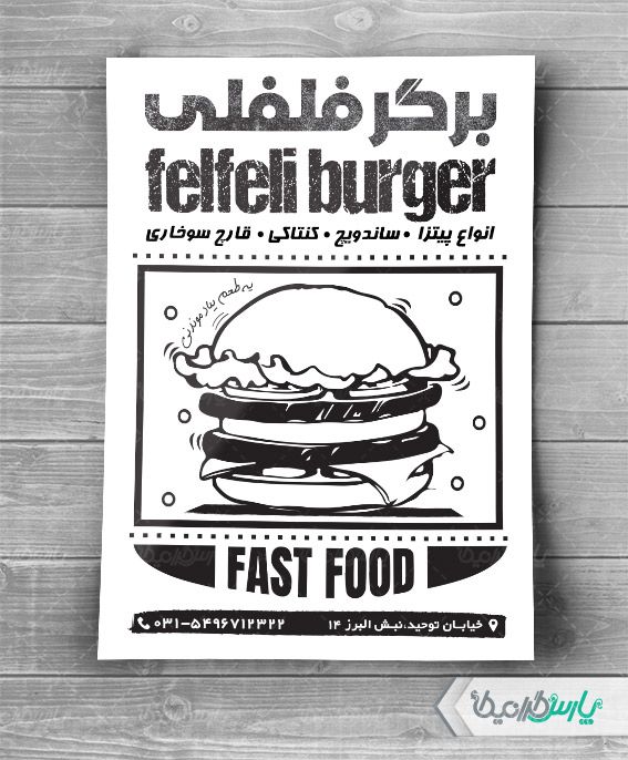 طرح تراکت سیاه و سفید اغذیه توسط تیم حرفه ای پارس گرافیک طراحی و در دسترس کاربران سایت قرار گرفته است.