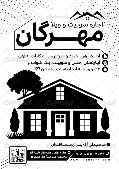 طراحی یک تراکت با زمینه مشکی و سفید برای اجاره سوئیت و ویلا میتواند جذابیت بیشتری به تراکت شما ببخشد و به خصوص اگر با وکتور ویلا طراحی شده باشد، میتواند براحتی توجه مخاطبان را به خود جلب کند.