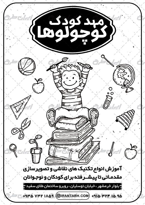 به طور کلی، طرح لایه باز تراکت مهدکودک با زمینه مشکی و سفید، همراه با وکتور کودک، یک ابزار کارآمد در تبلیغات و ترویج خدمات مهدکودکها میباشد. این طرح میتواند به شما در ایجاد تبلیغات جذاب و موثر برای جذب والدین و افزایش تعداد دانشآموزان کمک کند.