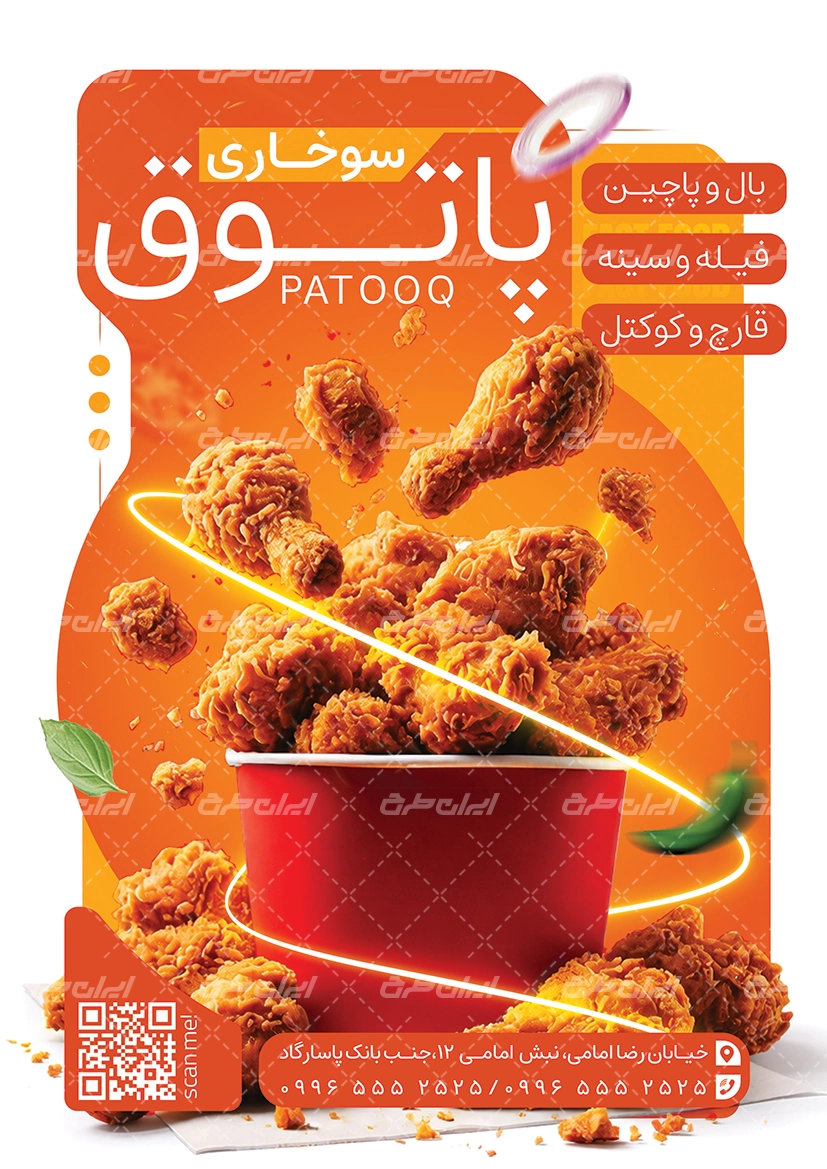 عکس مرغ سوخاری، تصویر مرتبط با طرح تراکت، فست فود، لیبل و شیپ های کاربردی می باشد که توسط طراحان ایران طرح در نرم افزار فتوشاپ طراحی شده است.