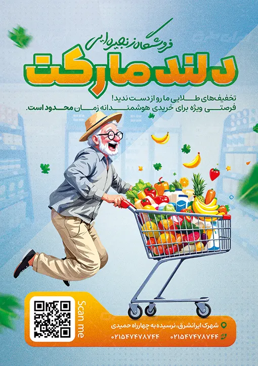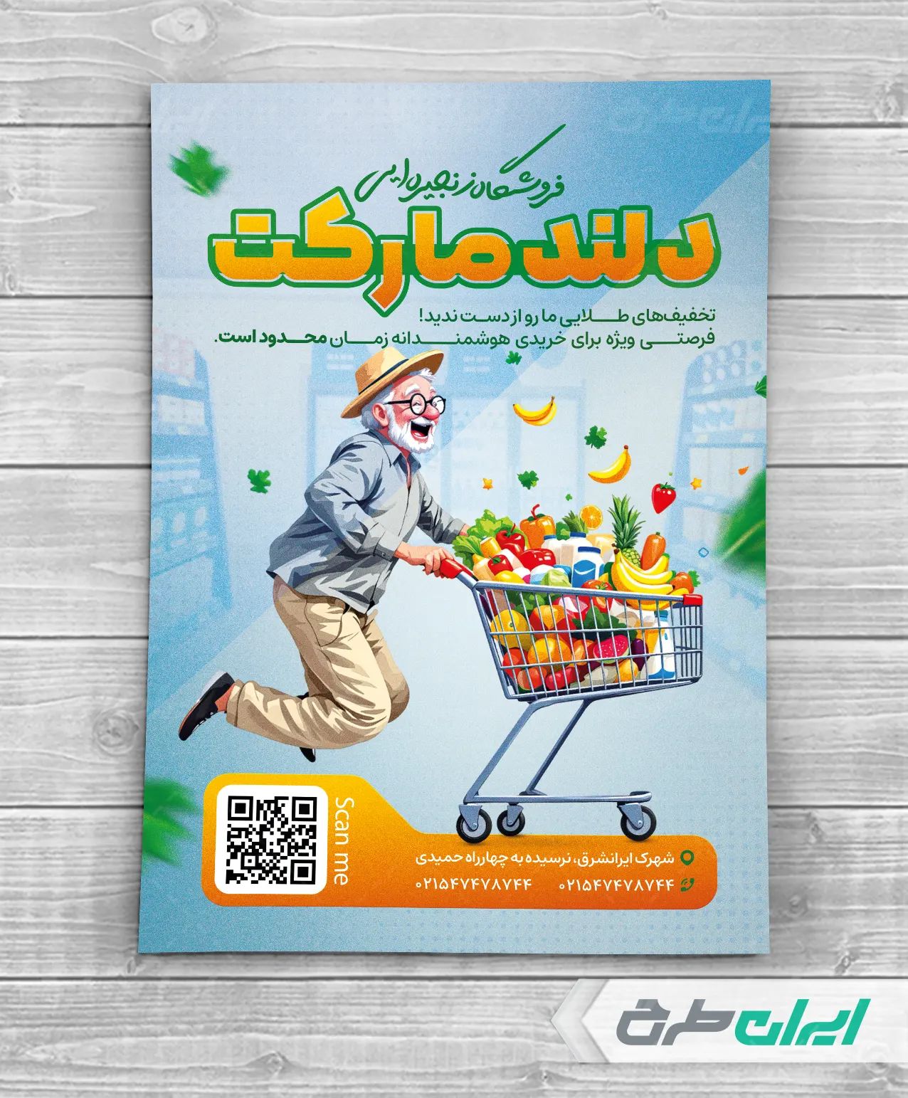 طرح تراکت لایه باز سوپر مارکت، توسط تیم ایران طرح برای بازاریابی و تبلیغات این فروشگاه طراحی شده است.