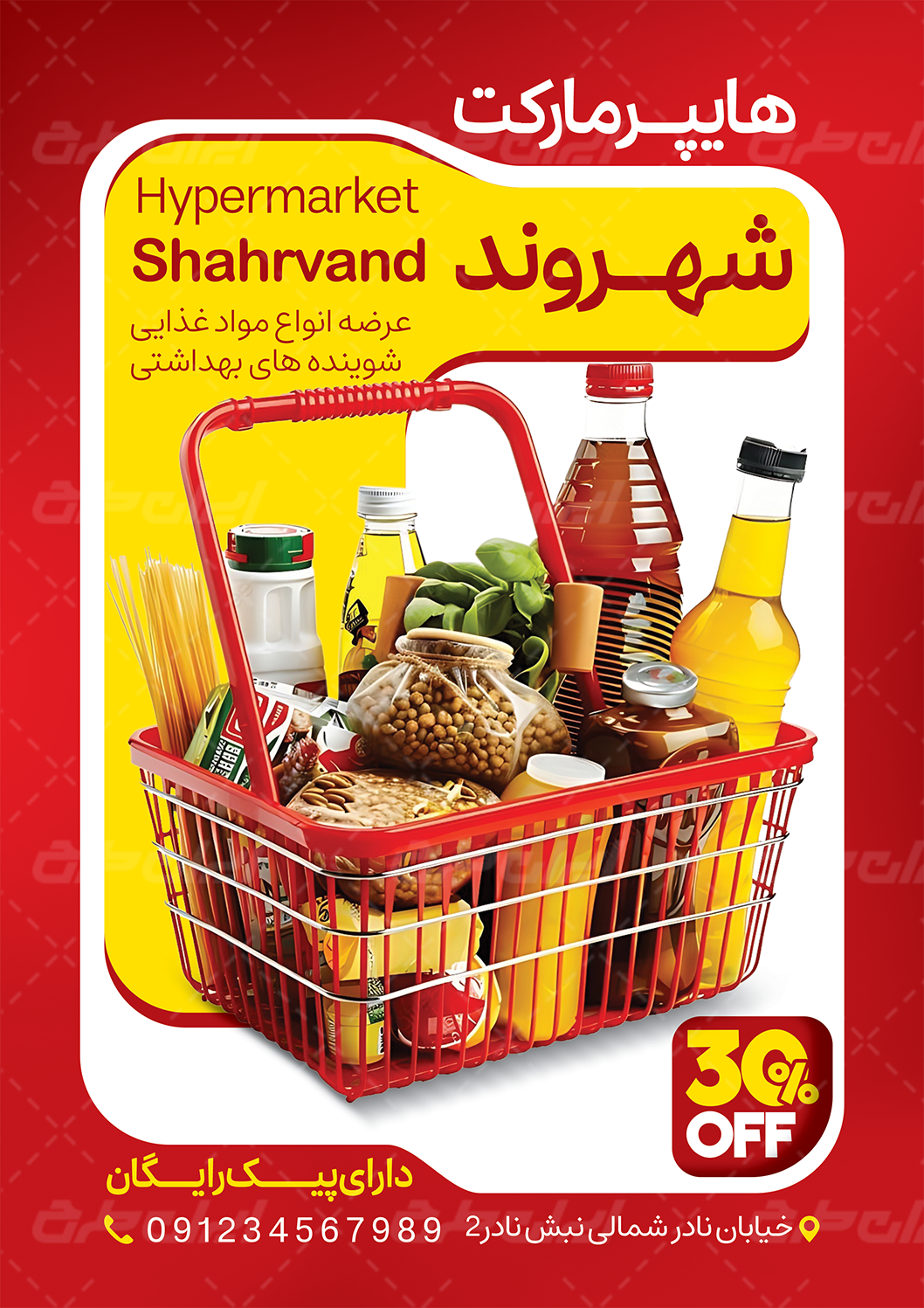 طرح تراکت لایه باز سوپر مارکت، توسط تیم ایران طرح برای بازاریابی و تبلیغات این فروشگاه طراحی شده است.