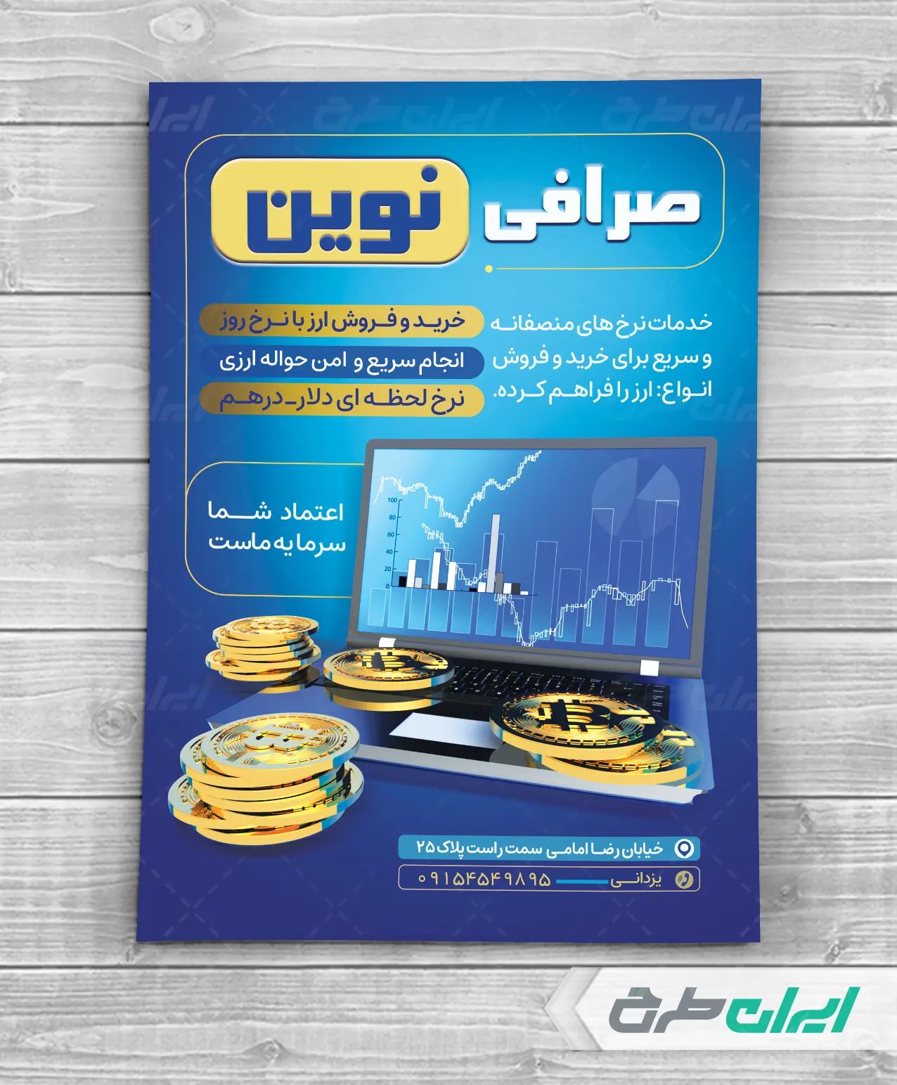طرح لایه باز تراکت صرافی، جهت بازاریابی و تبلیغات این دسته از مشاغل توسط تیم طراحان ایران طرح طراحی و در دسترس کاربران سایت قرار گرفته است.