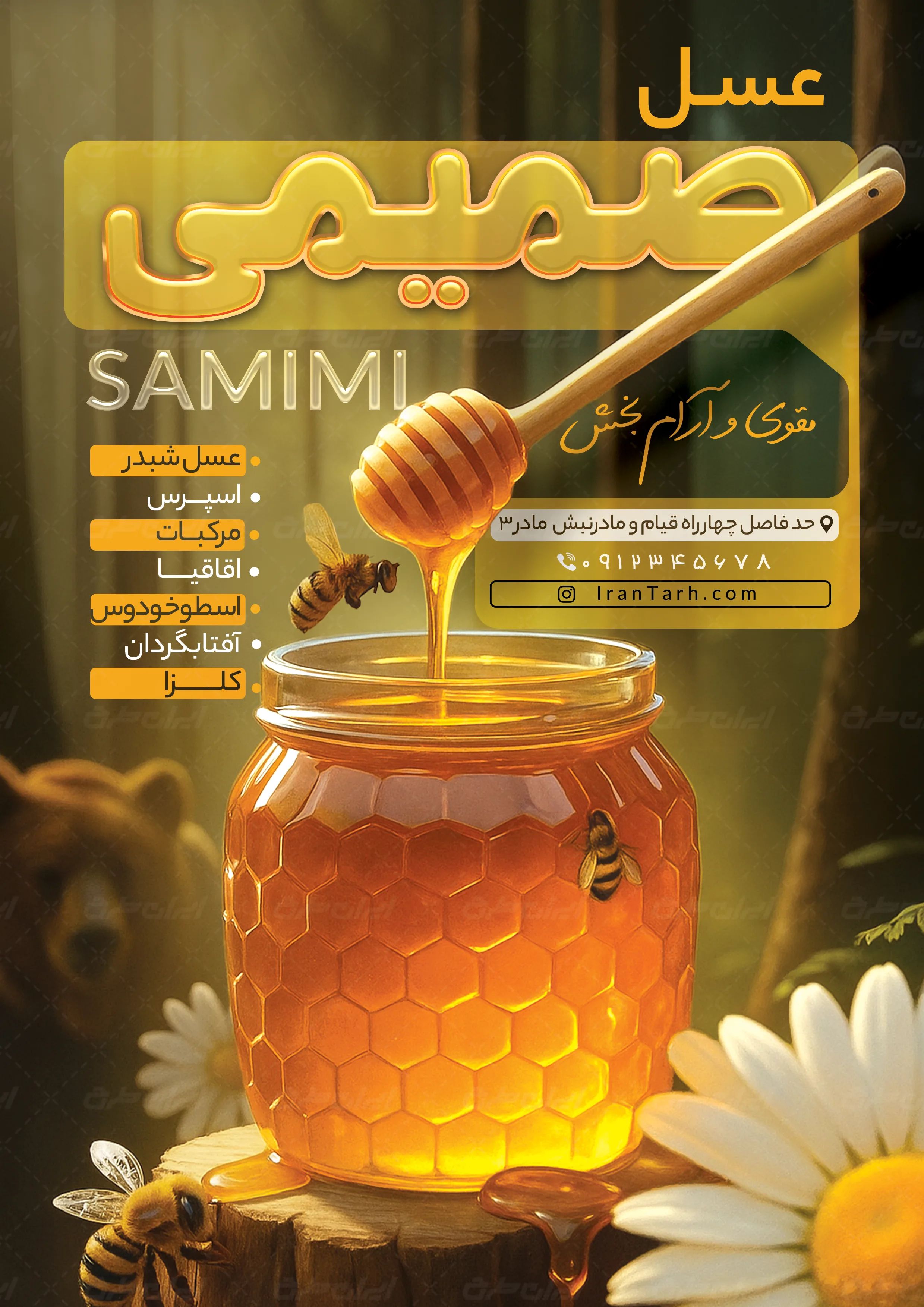 طرح تراکت لایه باز عسل فروشی، جهت بازاریابی و تبلیغات این دسته از مغازه ها توسط تیم طراحان ایران طرح طراحی و در دسترس کاربران سایت قرار گرفته است.